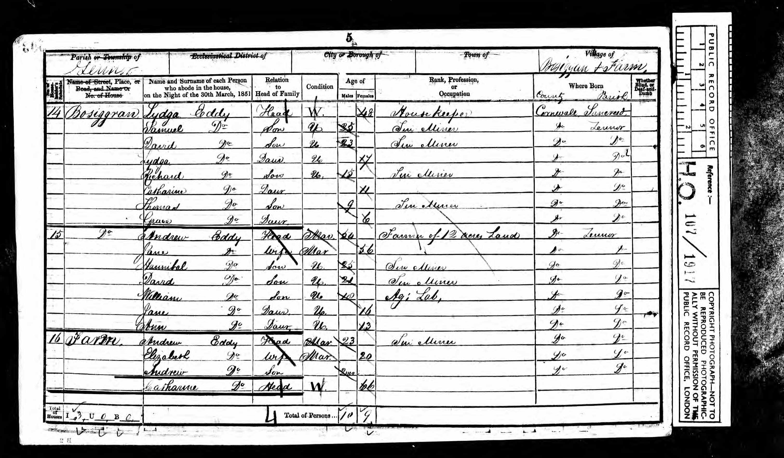 Cornwall OPC record 1179736 in the Marriages database: Day Month«tab»14-Dec Year«tab»1850 Parish Or Reg District«tab»Zennor Groom Fn«tab»Andrew Groom Sn«tab»EDDY Groom Age«tab»Full Groom Residence«tab»Bosigran Groom Condition«tab»Bach Groom Rank Profession«tab»Miner Groom Signed / Marked (S/M)«tab»M Groom Father Name«tab»Andrew Eddy Groom Father Rank Profession«tab»Farmer Bride Fn«tab»Elizabeth Bride Sn«tab»EDDY Bride Age«tab»Full Bride Residence«tab»Bosigran Bride Condition«tab»Spinster Bride Signed / Marked (S/M)«tab»M Bride Father Name«tab»William Eddy Bride Father Rank Profession«tab»Farmer Banns / Licence (B/L)«tab»B Witness Fn1«tab»John Witness Sn1«tab»EDDY Witness Fn2«tab»John Witness Sn2«tab»MANN? Transcriber«tab»Diane Donohue