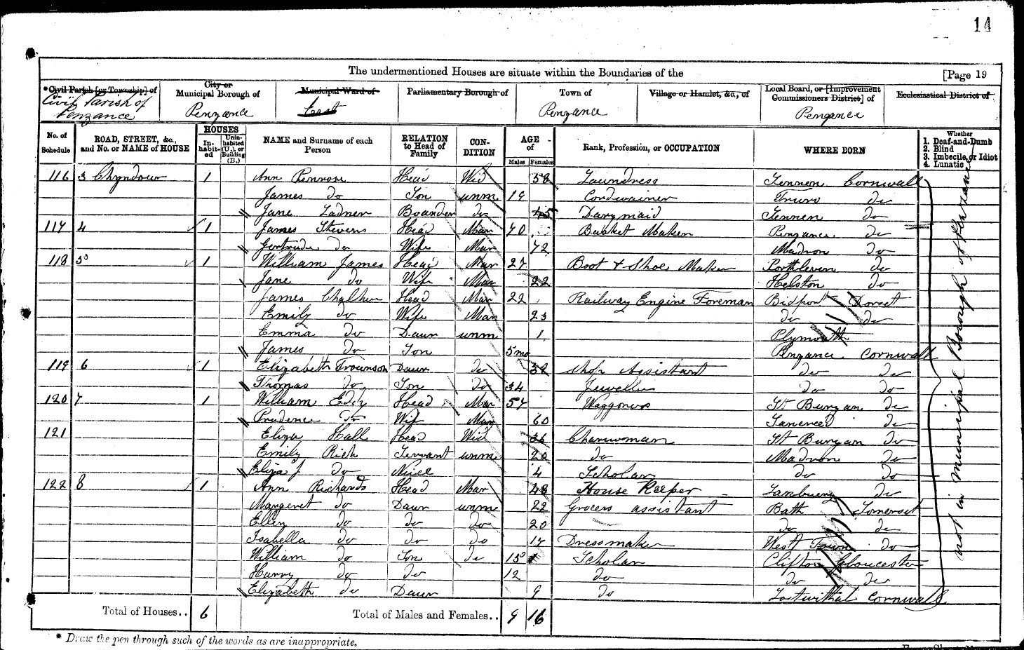 | Shared note | In the 1841 census, ref St Just in Penwith 9-63 (Kelynack): EDDY«tab»William«tab»25«tab»M«tab»Tin Miner«tab» EDDY«tab»Prudence«tab»30«tab»F«tab»«tab» EDDY«tab»Eliza«tab»5«tab»F«tab»«tab» EDDY«tab»William«tab»3«tab»M«tab»«tab» EDDY«tab»Matthew«tab»1«tab»M«tab»«tab» In the 1851 Census at No.28 at Bosistow Lane, St Levan (transcription courtesy of Geoff McKee): William«tab»EDDY«tab»H«tab»m«tab»38«tab»ag. lab.«tab»b.St Buryan Prudence«tab»"«tab»W«tab»m«tab»44«tab»«tab»b.St Just In the 1861 census, ref Penzance 17-50: EDDY«tab»William«tab»Head«tab»M«tab»48«tab»St Buryan CON«tab» EDDY«tab»Prudence«tab»Wife«tab»M«tab»51«tab»St Just CON«tab» EDDY«tab»Eliza«tab»Daughter«tab»U«tab»25«tab»St Buryan CON«tab» EDDY«tab»William«tab»Son«tab»U«tab»23«tab»St Buryan CON«tab» EDDY«tab»John«tab»Son«tab»U«tab»18«tab»St Buryan CON«tab» EDDY«tab»Richard«tab»Son«tab»U«tab»16«tab»St Buryan CON«tab» In the 1871 census, ref Penzance 15--120: EDDY«tab»William«tab»Head«tab»M«tab»57«tab»St Buryan - CON«tab» EDDY«tab»Prudence«tab»Wife«tab»M«tab»60«tab»Sancreed - CON«tab» In the 1881 census at 67 St James St, (Madron) Penzance, Cornwall, England. Source:«tab»FHL Film 1341564 PRO Ref RG11 Piece 2346 Folio 44 Page 37 William EDDY«tab»M«tab»70 «tab»M«tab»Sancreed«tab»Head«tab»Retired Prudence EDDY«tab»M«tab»74 «tab»F«tab»St Just«tab»Wife William EDDY«tab»M«tab»41 «tab»M«tab»Sancreed«tab»Son«tab»Labourer Grace EDDY«tab»M«tab»35 «tab»F«tab»Breage«tab»Sons Wife Prudence A. EDDY«tab»U«tab»9 «tab»F«tab»Penzance«tab»Daur«tab»Scholar Eliza EDDY«tab»U«tab»7 «tab»F«tab»Camborne«tab»Daur«tab»Scholar Mary L. EDDY«tab» «tab»4 «tab»F«tab»Penzance«tab»Daur William E. EDDY«tab» «tab»2 «tab»M«tab»Penzance«tab»Son Richard EDDY«tab» «tab»4 m«tab»M«tab»Penzance«tab»Son It looks like the relationships (to the head of the family) are incorrectly recorded, as Prudence A. etc. are William's grandchildren. |
