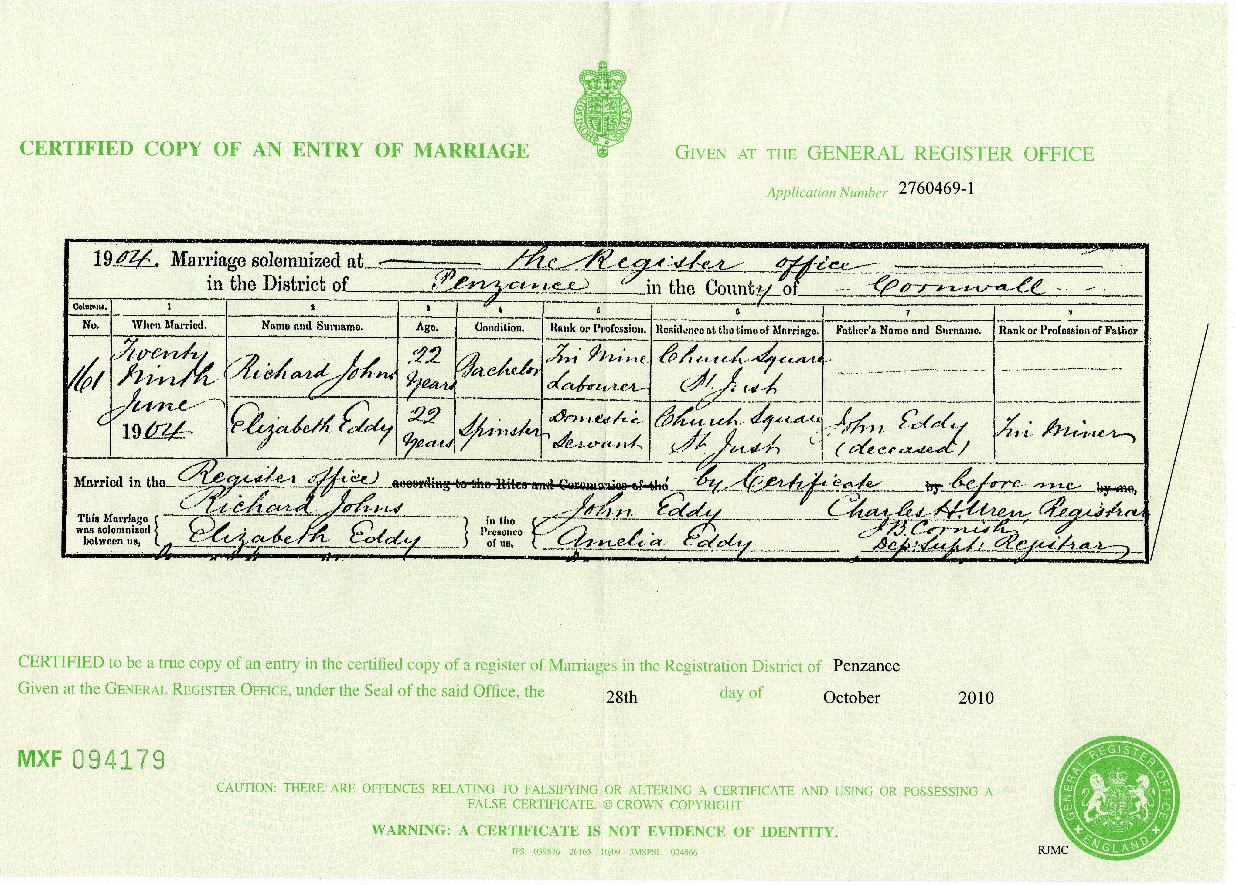 Marriage: 29 June 1904 — Register Office, Penzance, Cornwall, England |