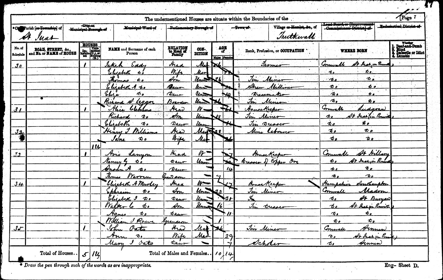 | Shared note | John was recorded as a miner of Church town when children John, Jane and John, were baptised (1843, 1845 and 1847) In the 1851 census at Princess Street, St Just (ref 3j-81): John Eddy Head M 30 Tin Miner St Just Cornwall Jane Eddy Wife M 30 St Just Cornwall Jane Eddy Dau 5 St Just Cornwall John Eddy Son 4 St Just Cornwall Mary Susan Eddy Dau 3m St Just Cornwall In the 1861 census at Pleasant Row, St Just (ref 14-150): John Eddy Head M 40 Tin Miner St Just Cornwall Jane Eddy Wife M 40 St Just Cornwall Jane Eddy Dau U 15 St Just Cornwall John Eddy Son 14 St Just Cornwall Mary S Eddy Dau 10 St Just Cornwall Edwin Eddy Son 7 St Just Cornwall Harriet Eddy Dau 6 St Just Cornwall William Eddy Son 4 St Just Cornwall James H Eddy Son 4m St Just Cornwall In the 1871 at Bosorne, St Just (ref 14-102): Eddy John Head M 50 Tin Miner St Just Cornwall Eddy Jane Wife M 50 St Just Cornwall Eddy Mary Susan Dau U 20 St Just Cornwall Eddy Edwin Son U 17 Tin Miner St Just Cornwall Eddy Harriet Dau 16 Scholar St Just Cornwall Eddy William Son 14 Drapers Shop Assistant St Just Cornwall Eddy James H Son 10 Scholar St Just Cornwall Eddy Alfred Son 8 Scholar St Just Cornwall |