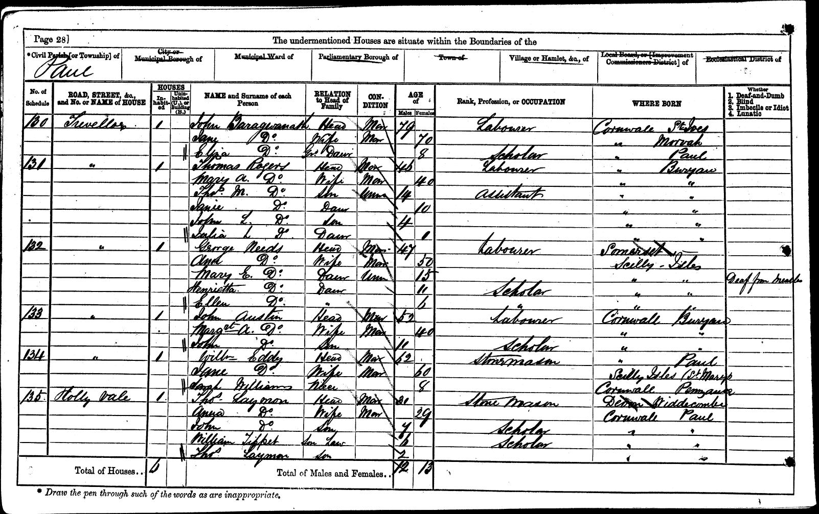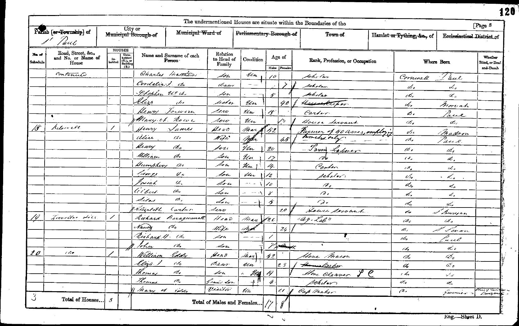 | Shared note | In the 1841 Census at Trevelloe, Paul, ref 22-44: EDDY William 30 M Agricultural Labourer EDDY Jane 30 F EDDY William 10 M EDDY Elizabeth 6 F EDDY Ann 5 F EDDY Thomas 1 M In the 1851 Census at Paul, ref 1918 f 349 116: EDDY William HD W 41 Stonemason EDDY Ann Pengelly DA U 17 EDDY Eliza Jane DA U 16 EDDY Thomas Henry SO - 10 EDDY George SO - 7 In the 1861 Census at Trevelloe Hill, Paul, ref 8-20: EDDY William Head M 52 Paul EDDY Eliza J Daughter U 23 Paul EDDY Thomas Son U 19 Paul EDDY Thomas Grandson - 4 Paul EDDY Mary A Visitor U 21 Gwinear CON. In the 'Whether blind or deaf-and-dumb' column, there is a note with 3 or 4 words that are illegible and then Penzance is recognisable. I'm not sure who were the parents of Thomas the grandson. In the 1871 Census at Trevelloe, Paul, ref 8-134: EDDY William Head M 62 Paul EDDY Jane Wife M 60 Isles of Scilly, St Mary's WILLIAMS Sarah Neice 8 Penzance In the 1881 Census at Lower Trevelloe, Paul, Cornwall, England. Source:«tab»FHL Film 1341563 PRO Ref RG11 Piece 2344 Folio 142 Page 19 William EDDY«tab»M«tab»72 «tab»M«tab»Paul«tab»Head«tab»Farmer 7 Acres Jane EDDY«tab»M«tab»69 «tab»F«tab»St Mary's, Isles of Scilly«tab»Wife Farmers Wife Sarah A. WILLIAMS«tab»U«tab»18 «tab»F«tab»Penzance«tab»Neice«tab»Dressmaker In 1891 Census with son George and family. There is probably a mis-transcription by CFHS of William's age in the 1891 census (88) as this contradicts records from the other census returns (ignoring 1841 where ages were rounded down to nearest 5). There is no obvious baptism record to match this William EDDY. The ages given in the census returns would suggest a birth year of 1809-1810. The census returns also give birth location of Paul. There are the following baptism records for a William EDDY between 1806 and 1811 and ignoring 4 from Wendron, Stithians and Budock that are very unlikely. Son of: (a) Oliver EDDY & Mary - 18 Jun 1806 St Just in Penwith (b) Nathaniel EDDY & - - 03 Nov 1807 Zennor (c) William EDDY & Jane - 08 Nov 1807 St Just in Penwith (d) William EDDY & Elizabeth - 22 Nov 1807 Paul (e) William EDDY & Elizabeth - 06 Mar 1808 St Buryan (f) James EDDY & Jane - 22 May 1808 St Just in Penwith (g) William EDDY & - - 21 Aug 1808 Zennor (h) William EDDY & Grace - 26 Nov 1808 St Just in Penwith (i) William EDDY & Elizabeth - 02 Apr 1809 St Just in Penwith (j) Andrew EDDY & - - 02 Jun 1811 Zennor Of these we can dismiss a, b, f, h and j, as these parents' names weren't passed down. Also (i) has been attributed to a different family, and there is a burial record in St Buryan (30 May 1829 age 22) which would match e. This leaves c, d, and g as possibles, of which d would appear to be the best match given that it is the only baptism in Paul, but this would make him older than recorded in the 1851-1881 census returns. I have tried to find a William EDDY born Paul about 1807 in the census returns without success, so in the absence of any better proof I have adopted d as the correct baptism for this William EDDY. Maybe the baptism entry was mis-transcribed and was 1809... I need to check the original. |