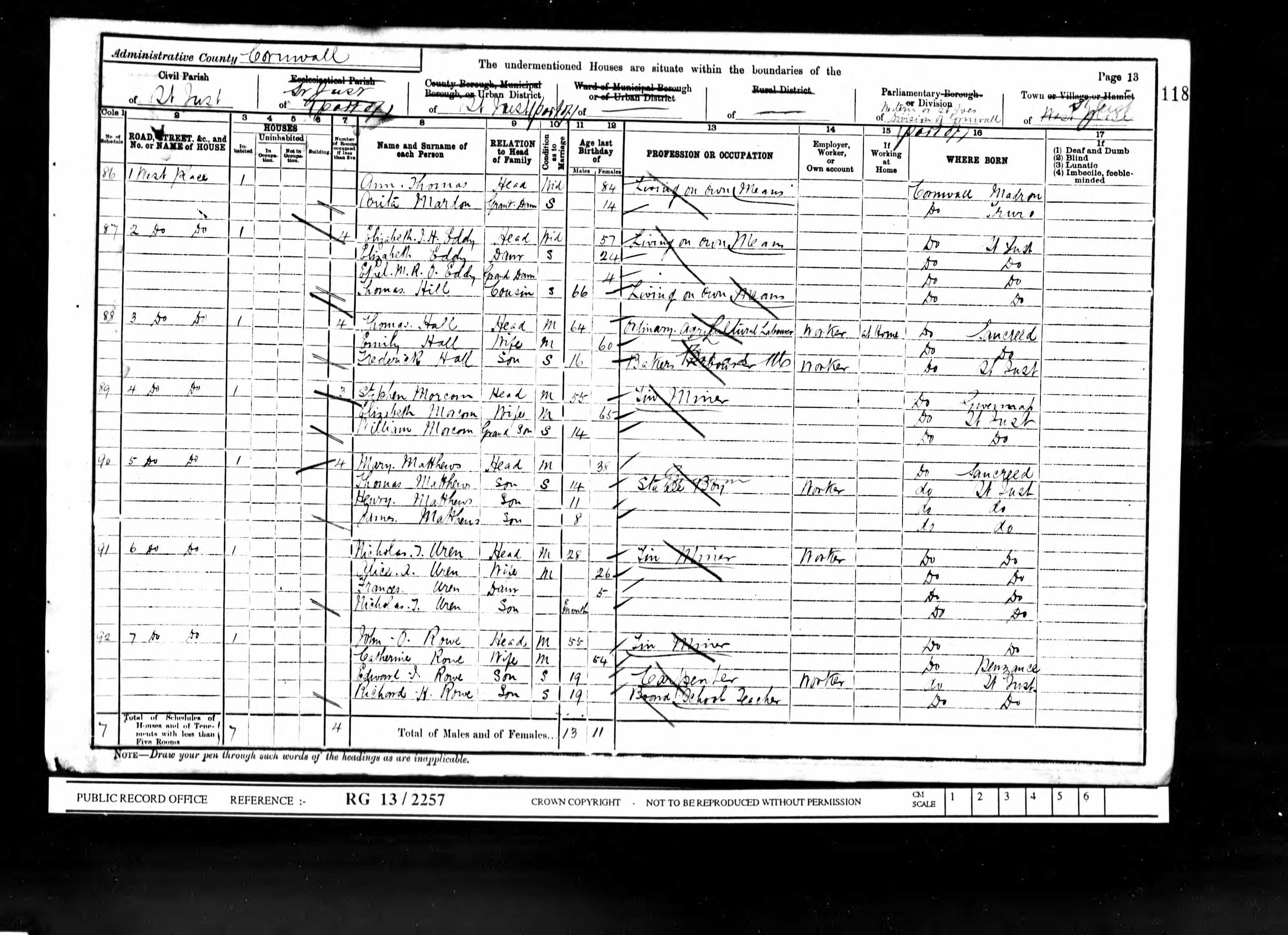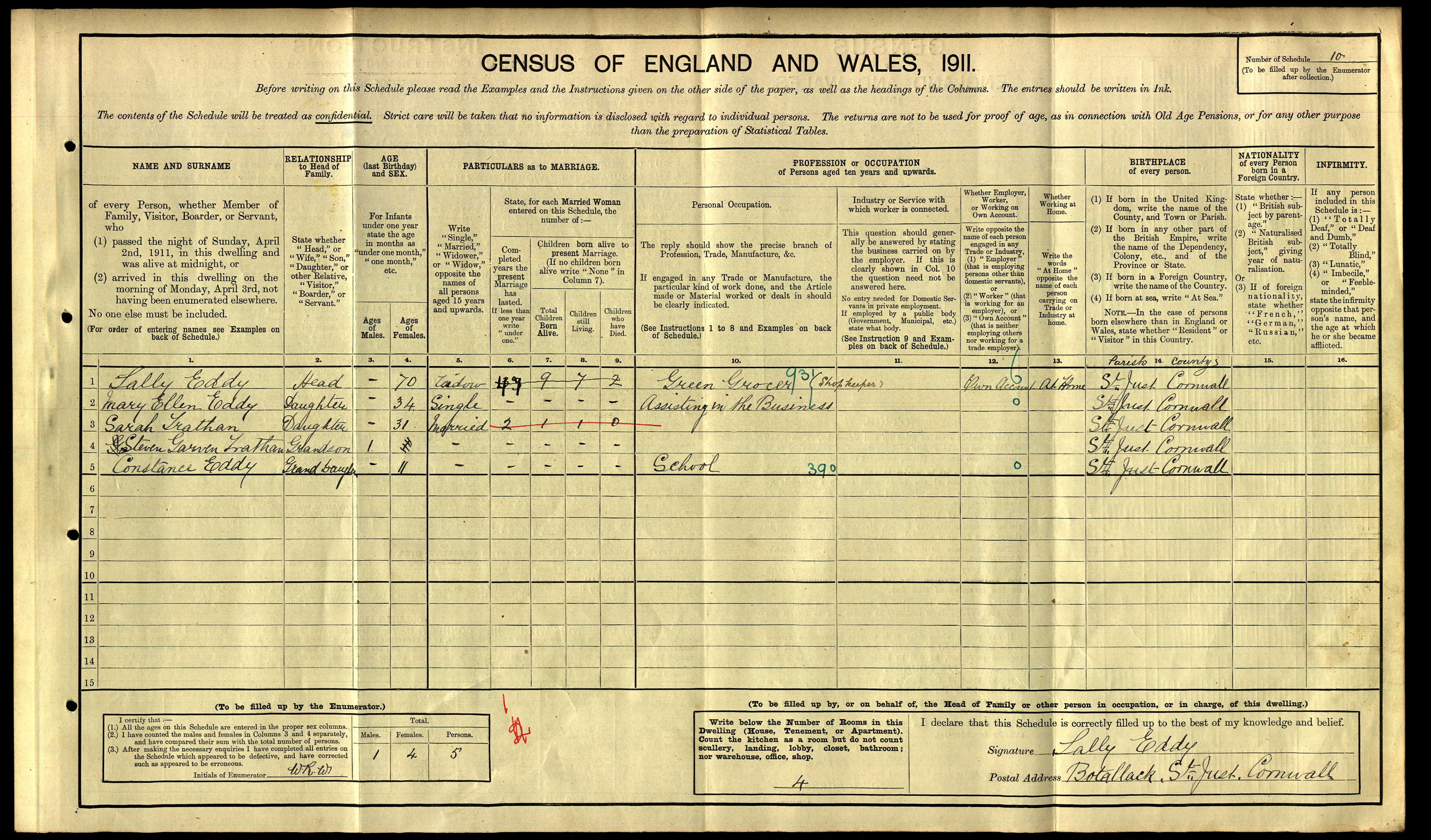 | Shared note | In the 1911 census at Botallack, St Just (ref 3-10): Sally«tab»Eddy«tab»H«tab»70«tab»W«tab»41?«tab»9-7-2«tab»Green Grocer (Shop Keeper)«tab»St Just Mary Ellen«tab»Eddy«tab»dau«tab»34«tab»S«tab»0«tab»0-0-0«tab»Assisting in the business«tab»St Just Sarah«tab»Trathan«tab»dau«tab»31«tab»M«tab»2«tab»1-1-0«tab»«tab»St Just Steven Garven«tab»Trathan«tab»gson«tab»1«tab»-«tab»-«tab»-«tab»«tab»St Just Constance«tab»Eddy«tab»gdau«tab»11«tab»-«tab»-«tab»-«tab»School«tab»St Just |