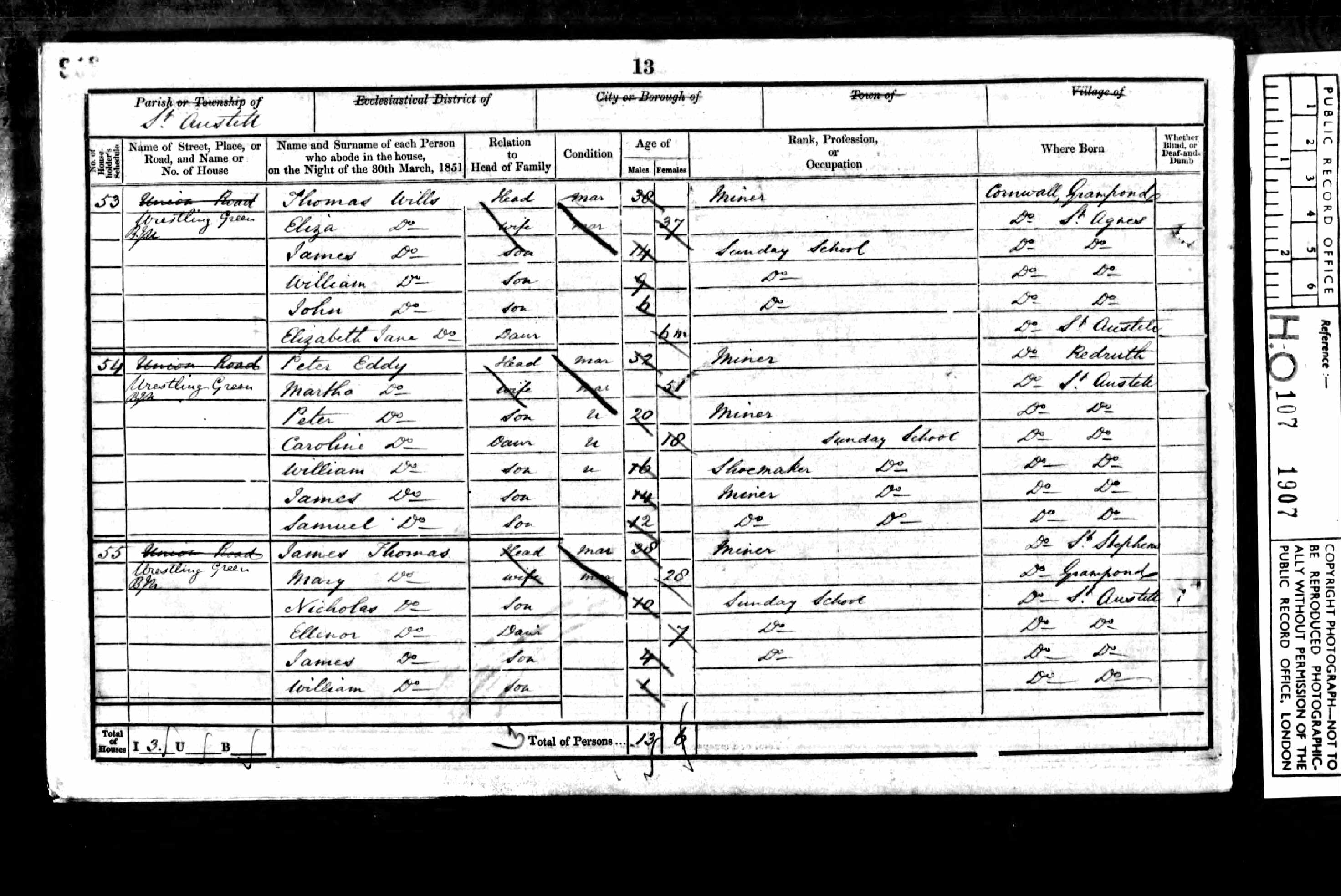 | Census 1851 | 1851 EDDY Peter (52) and fam - St Austell 1v-54 Wrestling Green.jpg Format: image/jpeg Image dimensions: 2,944 × 1,968 pixels File size: 474 KB Highlighted image: yes |