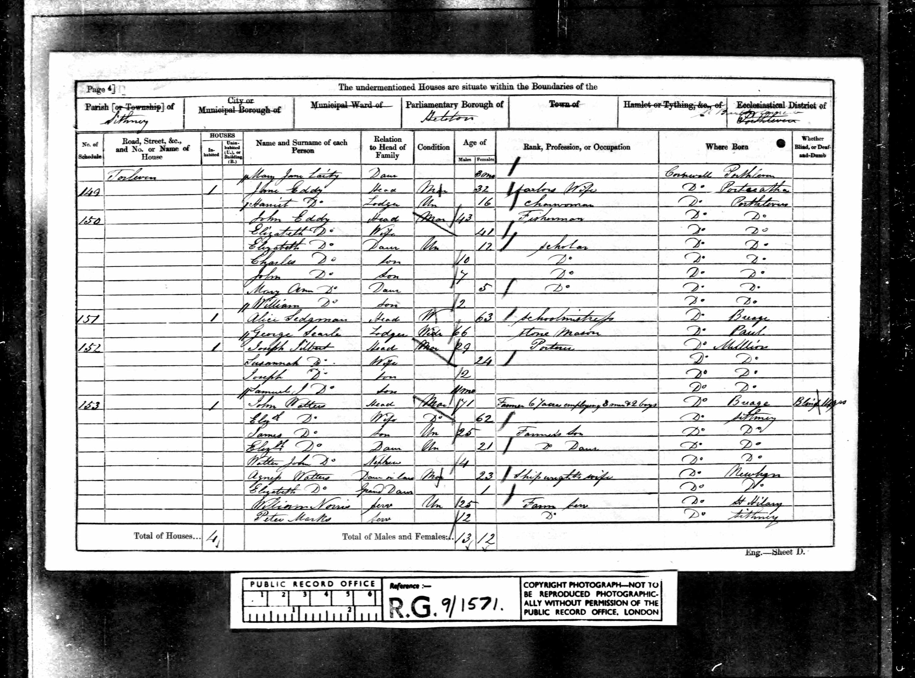 | 1871 Census | 1871 EDDY John (54) and fam - Helston 17-129 Torleven.jpg Format: image/jpeg Image dimensions: 2,941 × 2,175 pixels File size: 621 KB Highlighted image: yes |