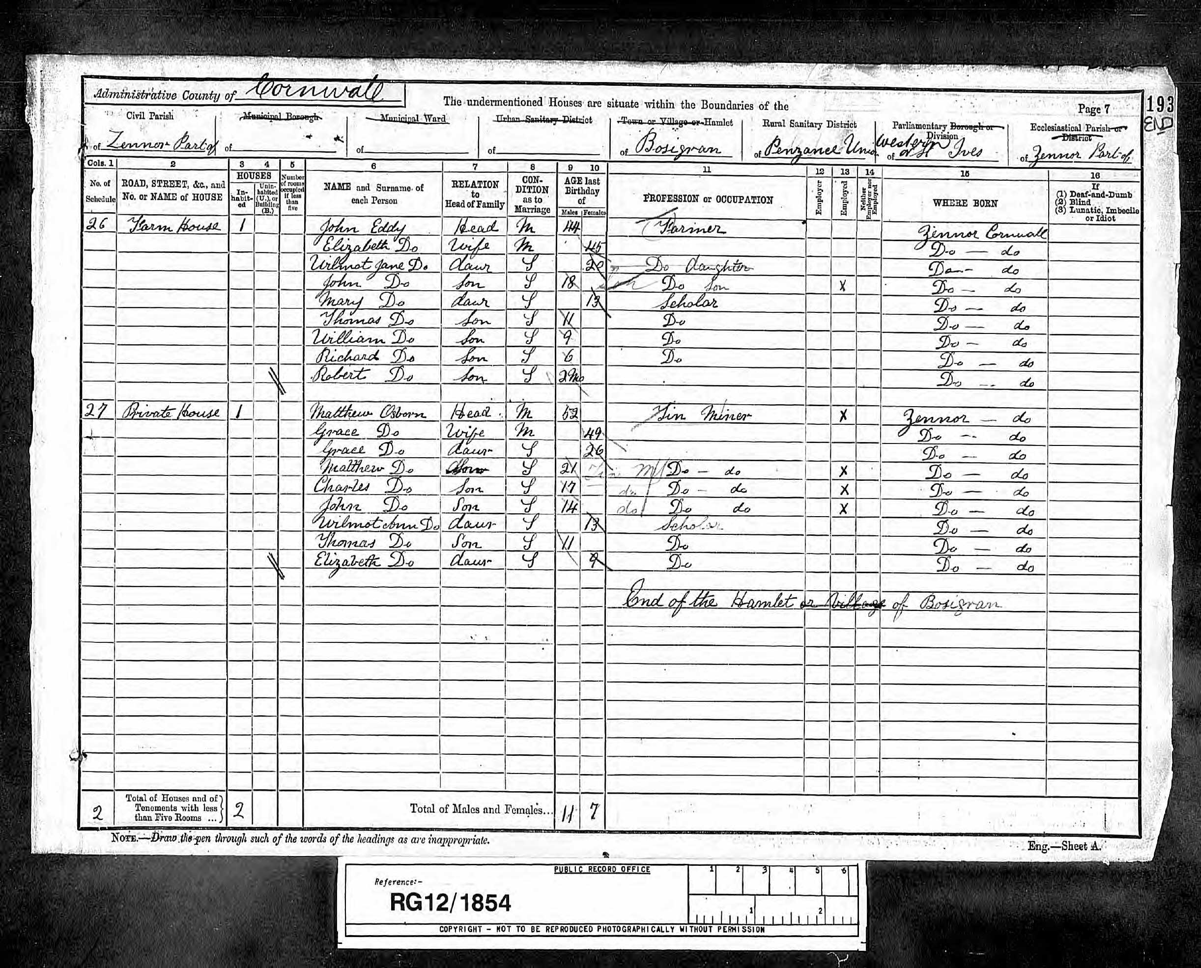 | Census 1891 | 1891 EDDY John (44) and fam - Zennor 18-26 Farm House Bosigran.jpg Format: image/jpeg Image dimensions: 2,444 × 1,971 pixels File size: 572 KB Highlighted image: yes |